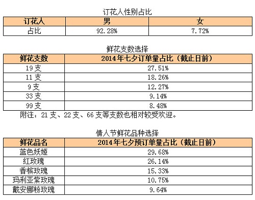 报道一出,引起了网友的广泛热议,同时也对情侣之间的鲜花赠送礼仪产生好奇:到底什么鲜花才是情侣之间最喜爱的?在2014年七夕来临之际,本地实体花店爱花居(www.aihuaju.com)运营总监杨女士针对日前收到的七夕订单量做出了详细的数据分析。